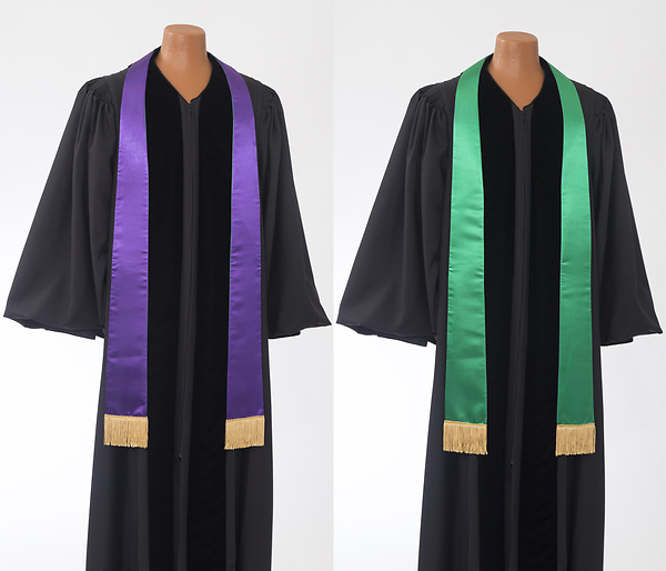 The quality, versatility, and value of this long-wearing satin reversible Purple/Green Stole make one of our most popular stoles. Gold-fringed edge; 92" long, 4 1/2" wide; tapers to 1 3/4" at the neck.