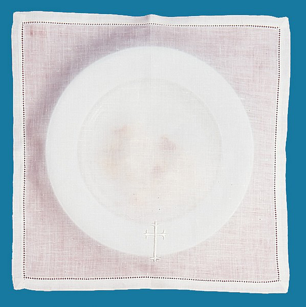 This fine quality pure linen bread plate napkin with embroidered Celtic cross is an attractive communion accessory to use with or without the element cover and may also be used to separate multiple bread trays. 13 1/2" square, and with 1/2" hem and mitered corners.