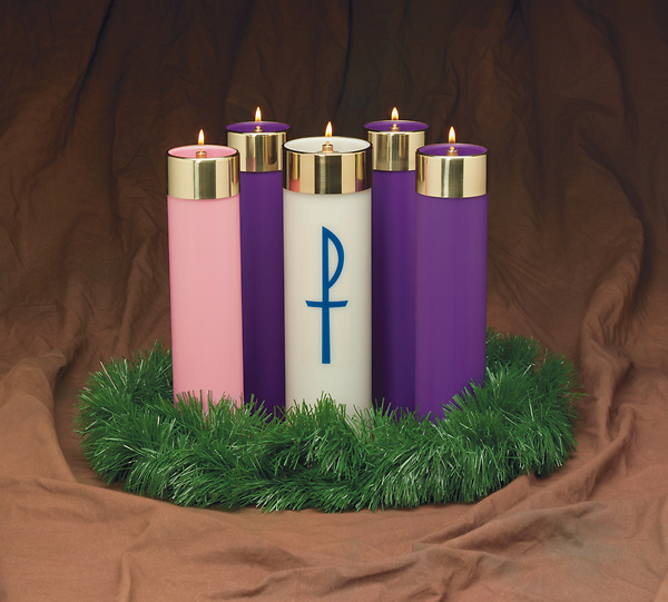 Brass followers are also included in this set which boasts an impressive 12” x 2 5/8” size for each candle, plus a 12” x 3 1/4” Christ candle featuring a special Chi-Rho symbol in blue adding distinctiveness to any table it is displayed on. (Greenery not included.)