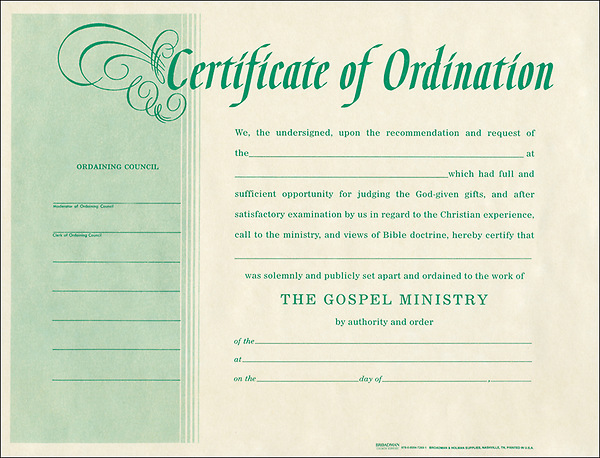 Package of 6 flat certificates (8 1/2" x 11") for minister ordination printed on beige parchment paper with green ink. Space for name, church, location, date and signatures of ordaining council. A free online template for this certificate is available at www.bhpublishinggroup.com.