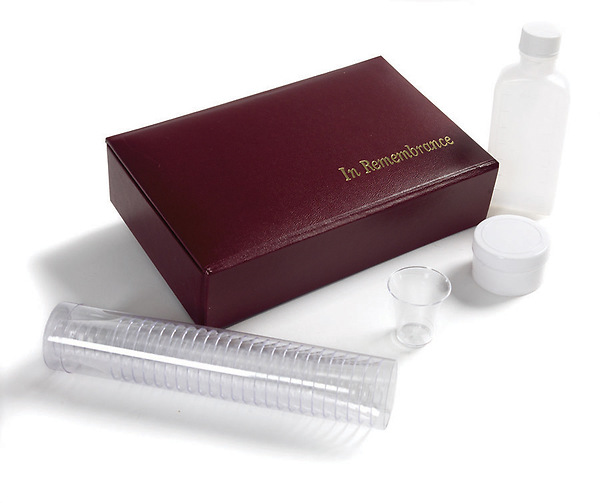 Maroon portable communion set contains 25 disposable cups in a reusable plastic sleeve, a plastic container for juice, and a plastic container/server for communion bread. Made of heavy-duty cardboard, the box is wrapped in a leather-look paper with padded cover and magnetic closure; juice and bread not included.