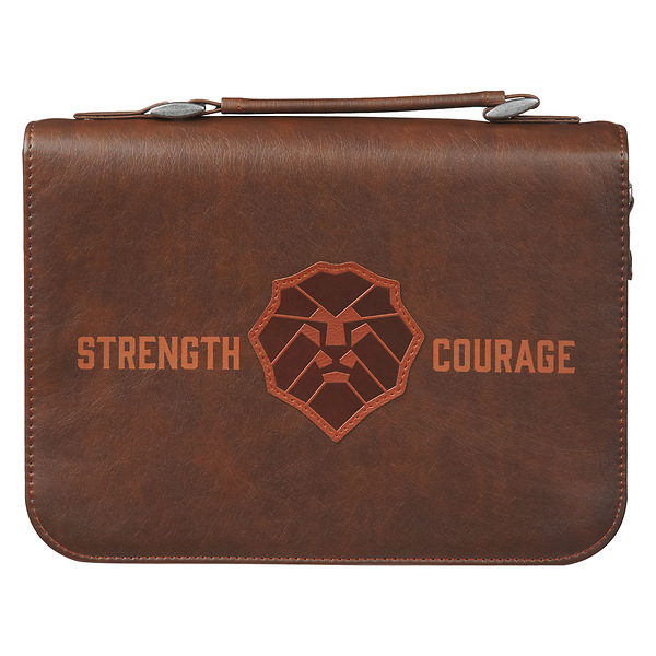 The Strength and Courage Honey-brown Faux Leather Classic Bible Cover is part of the Strength and Courage Brown Lion Collection, designed to encourage sons to rely on the Lord. This collection also includes a stainless steel water bottle, a classic journal, and a KJV Bible.
