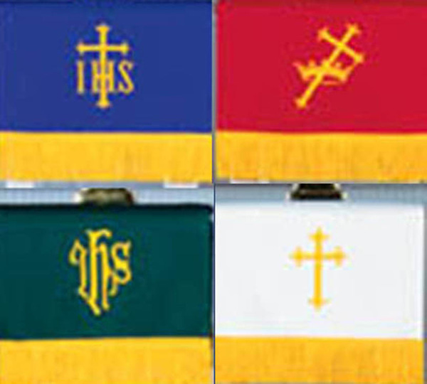 These reversible Purple/Green and Red/White Flower Stand Covers feature machine embroidered gold-colored images on 100% polyester polyfaille, strengthened with interlining, and finished with gold-colored fringe; economically priced and characterized by excellent construction. Cover measures 14” x 36” long.