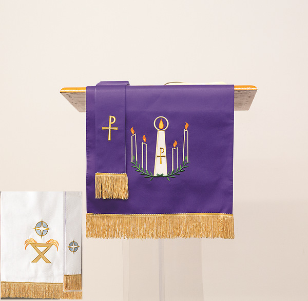 The Advent side is purple. The Bookmark has the Chi Rho image, while the Pulpit Scarf features the Advent wreath.