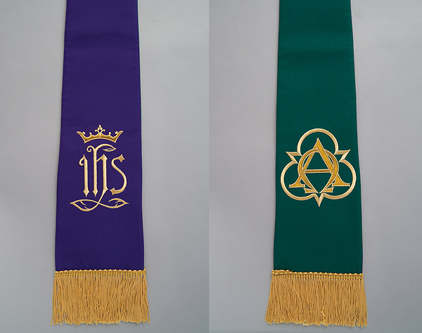 The purple side of the Stole features crown over IHS image; the green side of the