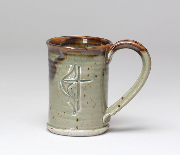 This unique and beautifully handcrafted green ceramic mug is deeply etched with the Cross and Flame emblem. This large capacity straight-shaped mug with an easy-to-grip handle is highly functional and easy to use. This mug is also available in blue and tan, with barrel-shaped mugs available in green, deep blue and tan.