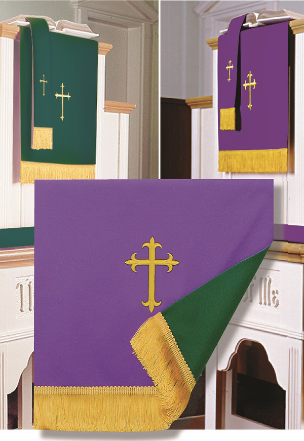 Economically priced, this handsome reversible Purple/Green Bookmark and Pulpit Scarf Set offers excellent construction; each piece will retain its shape and beauty for years to come--features machine embroidered gold-colored symbols on 100% polyester polyfaille, strengthened with interlining, and is finished with gold-colored fringe.