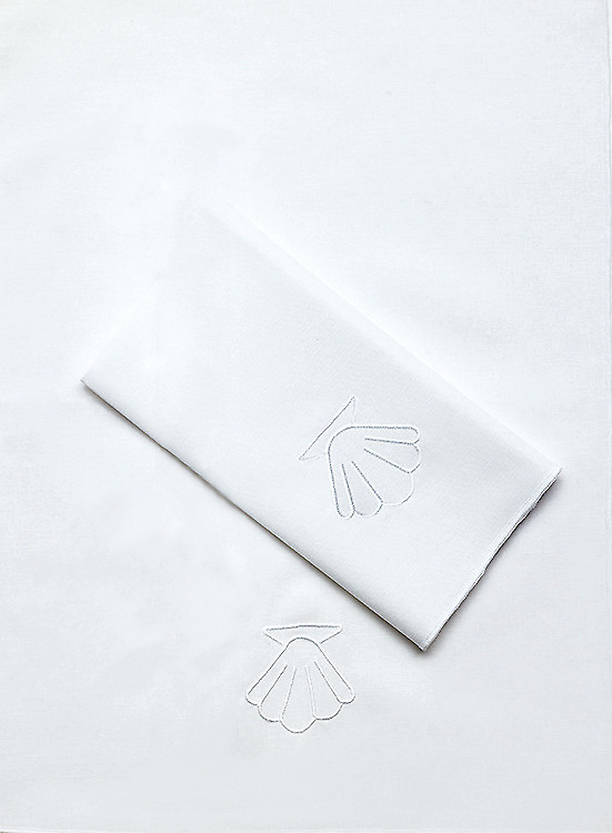 baptismal towel from Gaspard features an embroidered shell on a 100% cotton with a pearl edge hem. It measures 10" X 13.5".