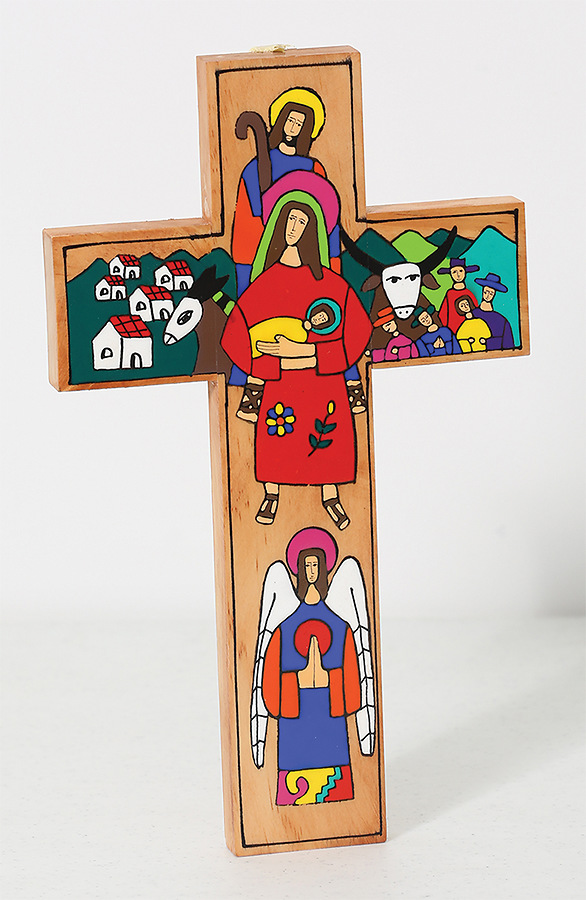 12" wooden cross featuring colorful, painted nativity scene.