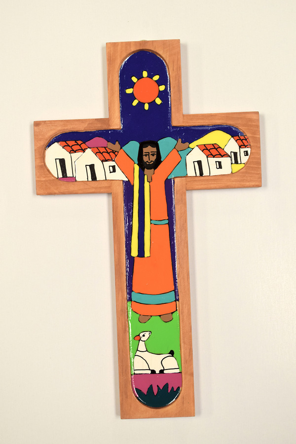 This beautiful hand crafted wooden, brightly painted Resurrection Cross is made by artisans in El Salvador. Measures 12"H.