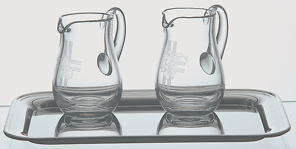 Cruet Set. 6" x 9" stainless steel tray. Engraved crystal cruets 3-1⁄2"H., 4 oz. cap.