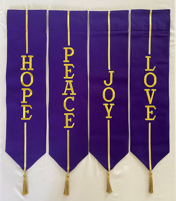 This four piece Advent banner set enhances the beauty of any Advent wreath. Each banner features a theme for each week of Advent (Peace, Love, Hope, Joy) and are secured on the wreath with a Velcro strip. 26-1/2" long (not including tassels) by 6-1/2" wide. Made in the USA of purple Liberty fabric and gold metallic thread.