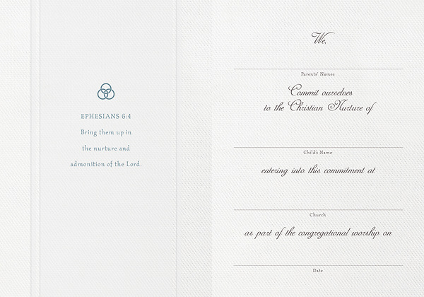 This well-designed folded Parchment Paper Dedication certificate works well for Dedication occasions. Scripture: “Bring them up in the nurture and admonition of the Lord.” Ephesians 6:4 (KJV) Space for name, date, Church and Address, and pastor’s signature. 5.5'' x 3.5''. Pack of 6.