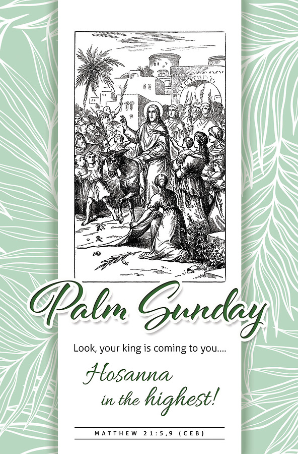 The proclamation "Look, your king is coming to you... Hosanna in the highest!" from Matthew 21:5,9 (CEB) invites worshippers into the Palm Sunday celebration.