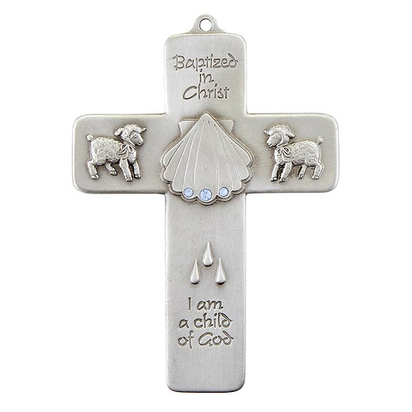 This pewter cross features blue jewels for a boy. Engraving in the cross that reads "Baptized in Christ I am a child of God.