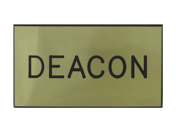 Brushed gold formica badge with DEACON engraved. Attaches via magnet on the back. 1-1/4" x 2-1/4".