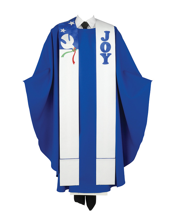 Our Christmas Peace and Joy Stole will be a delight for all during Advent! Featuring white satin stars and dove (holding red and green ribbons) on subtly sparkling blue sky panel and the word JOY on the left white panel, it is sure to bring a smile to all who see it! Add it to your vestment collection this year! Made in USA!