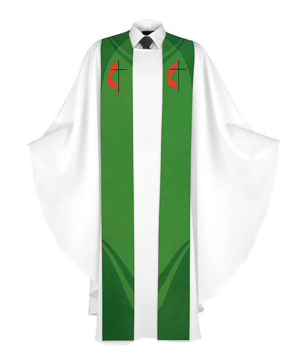 The Cross and Flame Stole provides you with a bold and beautiful way to celebrate your faith and affiliation to the United Methodist Church each Sunday. Our economy line paraments are quality-crafted to be timeless pieces, printed on 100% polyester satin, this Stole comes with a matte finish for a crisp and clean look. The complete set (see below) includes the Altar Frontal, Pulpit Scarf, and Bible Marker - all of which have been designed to inspire your congregation every time they enter your sanctuary! Ready to upgrade your vestments? Look no further than the Cross and Flame Stole – order today! Made in USA.