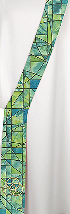 This Deacon style stole features three intertwined circles--the symbol for the trinity--on a green stained-glass background.