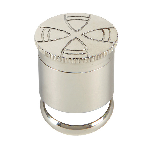 This single oil stock is made of stainless steel and features a ring on the bottom that makes it easier to hold while anointing congregants. 1" high, 1-1/4" diameter.