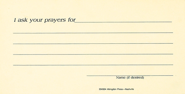 Encourage effective, specific prayer with prayer request cards, and encourage members and visitors alike to share concerns with the church family. The cards also allow for anonimity for those not comfortable with speaking in front of crowds.
