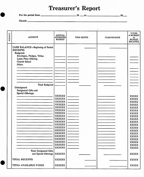 These Treasurer’s Report sheets are part of the Abingdon Church Financial Record System. Each sheet allows the treasurer to report on all church financial transactions for the month and year to date. Each sheet is 8 1/2" x 11”. The downloadable file contains a six-page PDF document.