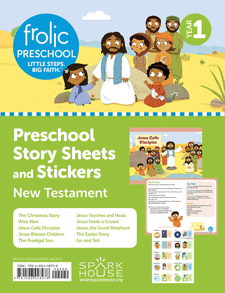 Children can add stickers to the Story Sheet that accompanies each story, with the other side providing ideas for families to continue exploring the story at home. Ten Story Sheets and Stickers go with the ten New Testament stories in the Frolic Preschool Bible for Frolic Preschool Sunday school.