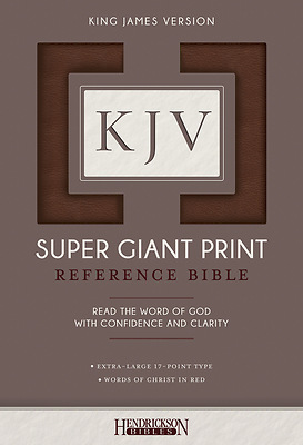 The brand-new King James Version Super Giant Print ReferenceBible, with generous 17-point type, is a readable choice for thosewho need a larger font. Competitive pricing and many excellentfeatures set this beautiful Bible apart, and make it a welcomeedition to Hendrickson s KJV Bibles line.