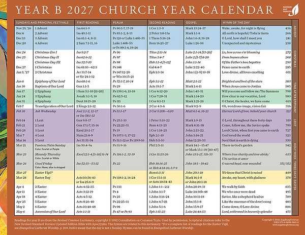 This full-color, two-sided worship planning and devotional resource gives specific dates, Bible readings, hymn of the day, and liturgical color for Sundays and festivals of the church year.
