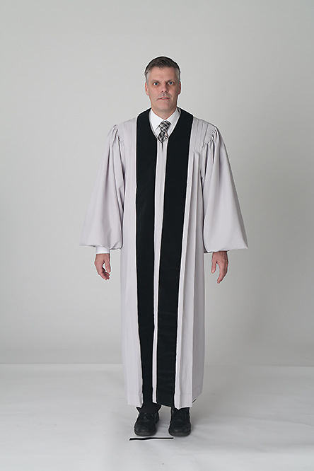 Beautiful pulpit robes to be worn with distinguished pride and comfort are now available to you on a Speedship basis. These robes are tailored by expert craft people to standard sizes. Medium weight Liberty 100% polyester provides for a fine drape yet comfortable in all climates. Majestically adorned with rich velveteen panels either plain or embroidered with Latin Cross. Matching cording outlines side pleats. Double lined sleeves with cuff for a bell effect sleeve. Full precision fluting across shoulder and back gives beautiful drape.