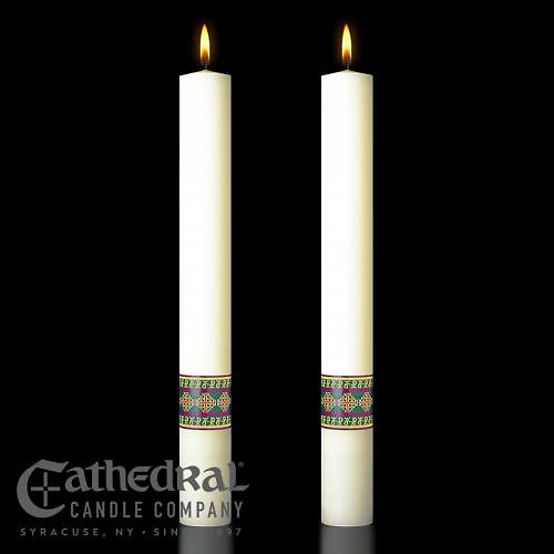 These attractive Altar Candles act to enhance the presence of the Paschal Candle - a perfect decorative touch!. 51% Beeswax. Sold as pair. Made in the USA.