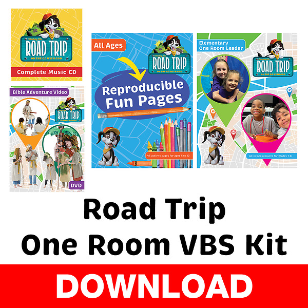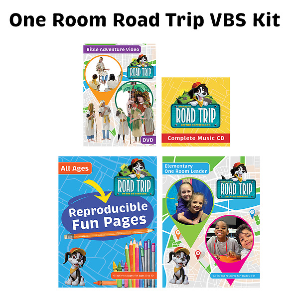 Helping children discover God’s presence everywhere.Road Trip One Room VBS Kit is perfect for churches who want to offer VBS but don't have a large number of kids and/or volunteers. One Room VBS can be done with as few as two leaders and in just one room and is for ages 5-12. Each of the 5 Sessions include Activities, Bible Story, Science, Active Learning Option, Recreation, Crafts, and Music.