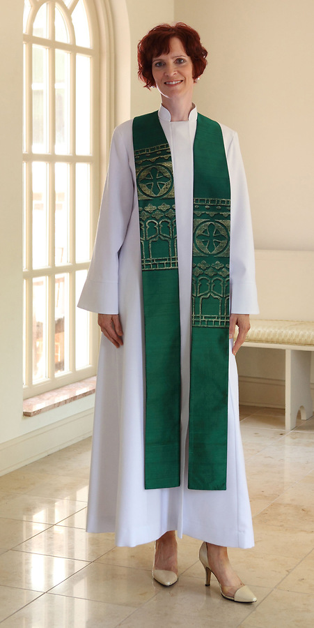 Each Abbey stole is a work of art, no two are exactly alike. The image is created by a hand-carved wood block stamped on the silk; each meticulously hand stamped one at a time. There will be slight variations in the color of the print on the silk. The fabric is vibrant silk Dupioni. The stole has a curved neck design allowing it to lay so much better than a straight or v-style stole. It is 5” wide and comes in two lengths: Petite (96”) and Average/Tall (104”). This stole is available in blue, green, purple, red, vanilla, and white. The standard design has the patterns set asymmetrically. Please see SP218947 for symmetrical design.